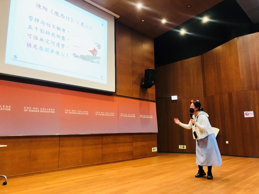 施教授先以《詩‧大序》指出古人創作詩詞後,還會以歌詠、動作、表情等作為輔助,把情感發揮得淋漓盡致,繼而指出詩詞「朗讀」與「朗誦」的分別,並從性質、要求、方法三方面詳加解說。